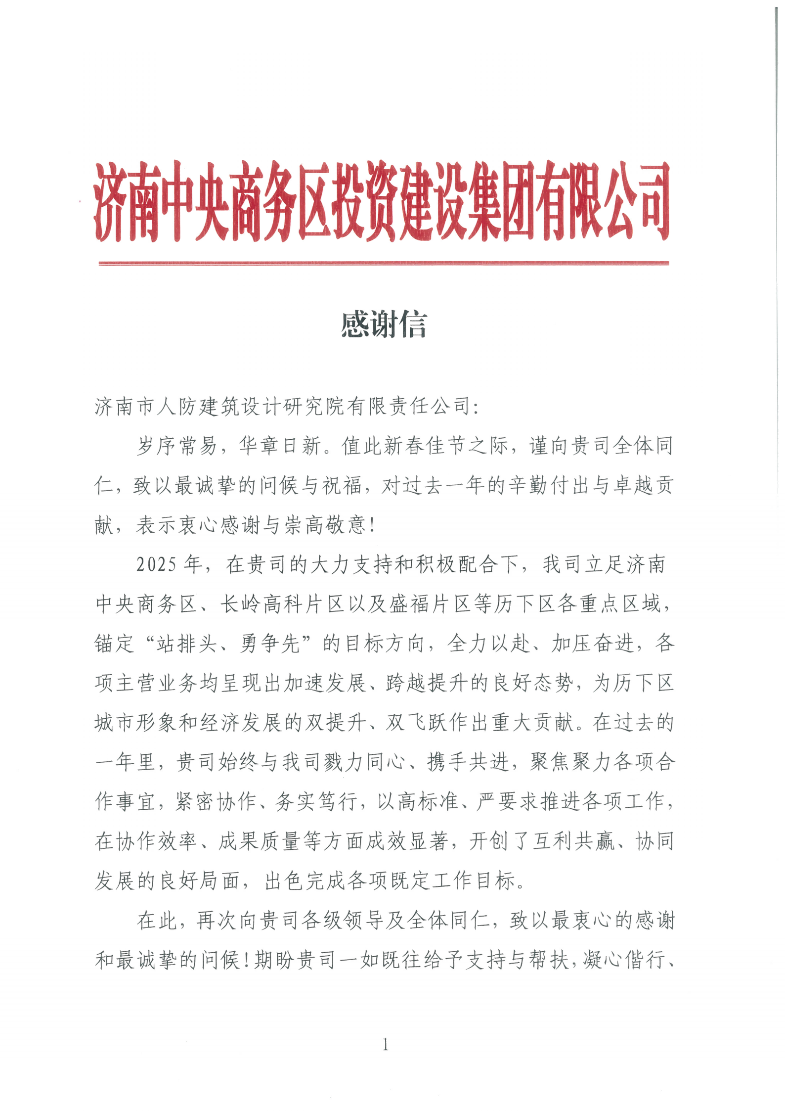 近日,我院陆续收到来自济南高新区管委会审批服务部、济南市城乡建设发展服务中心、济南新旧动能转换起步区管理委员会建设管理部、济南中央商务区投资建设集团有限公司等多家单位的感谢信。济南中央商务区投资建设集团有限公司还专程赠送“高效协同 追求卓越 精诚合作 携手共赢”锦旗。这些荣誉既是对我院技术团队过去一年辛勤付出的认可,更是对各合作单位长期以来的信任与支持。