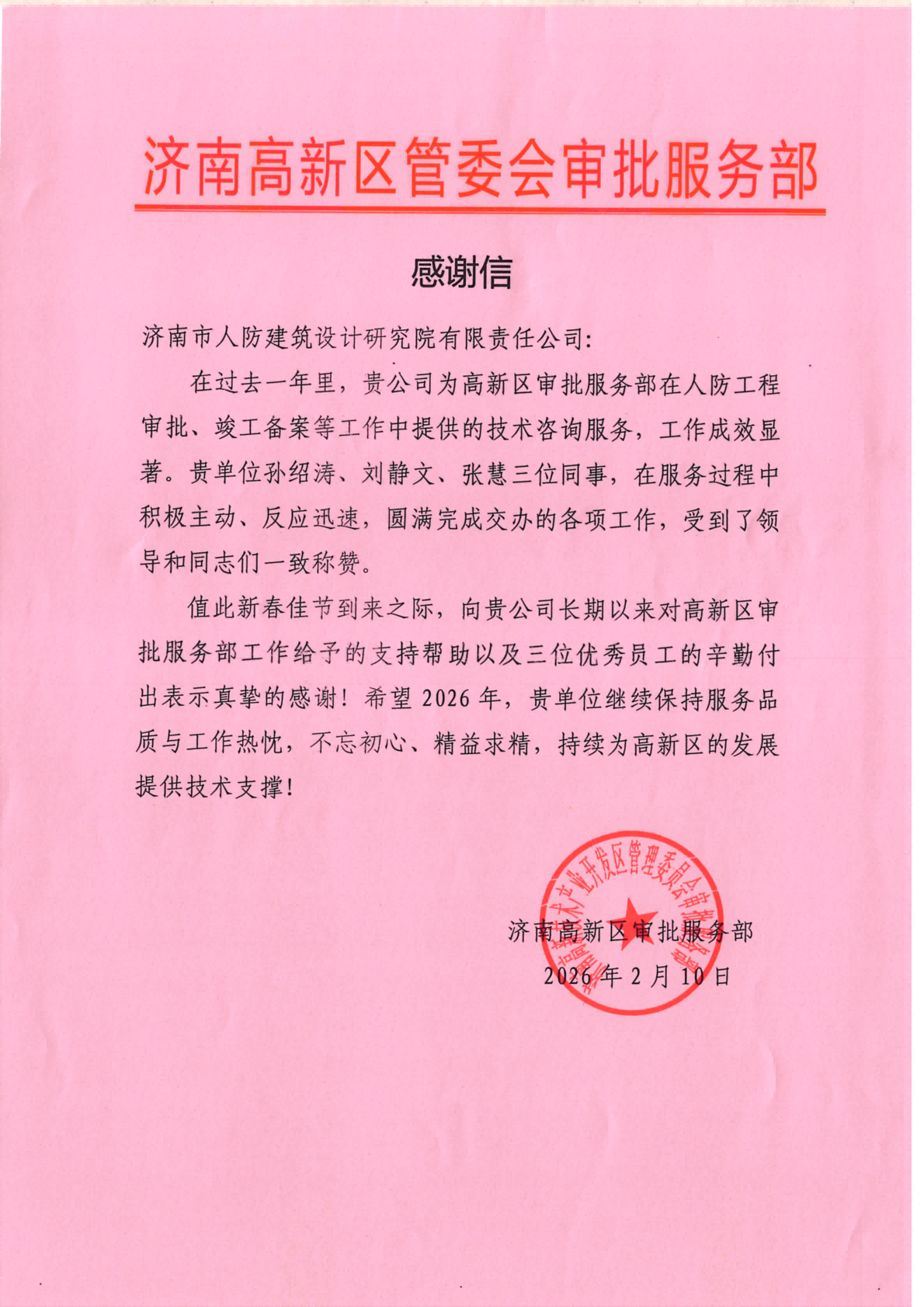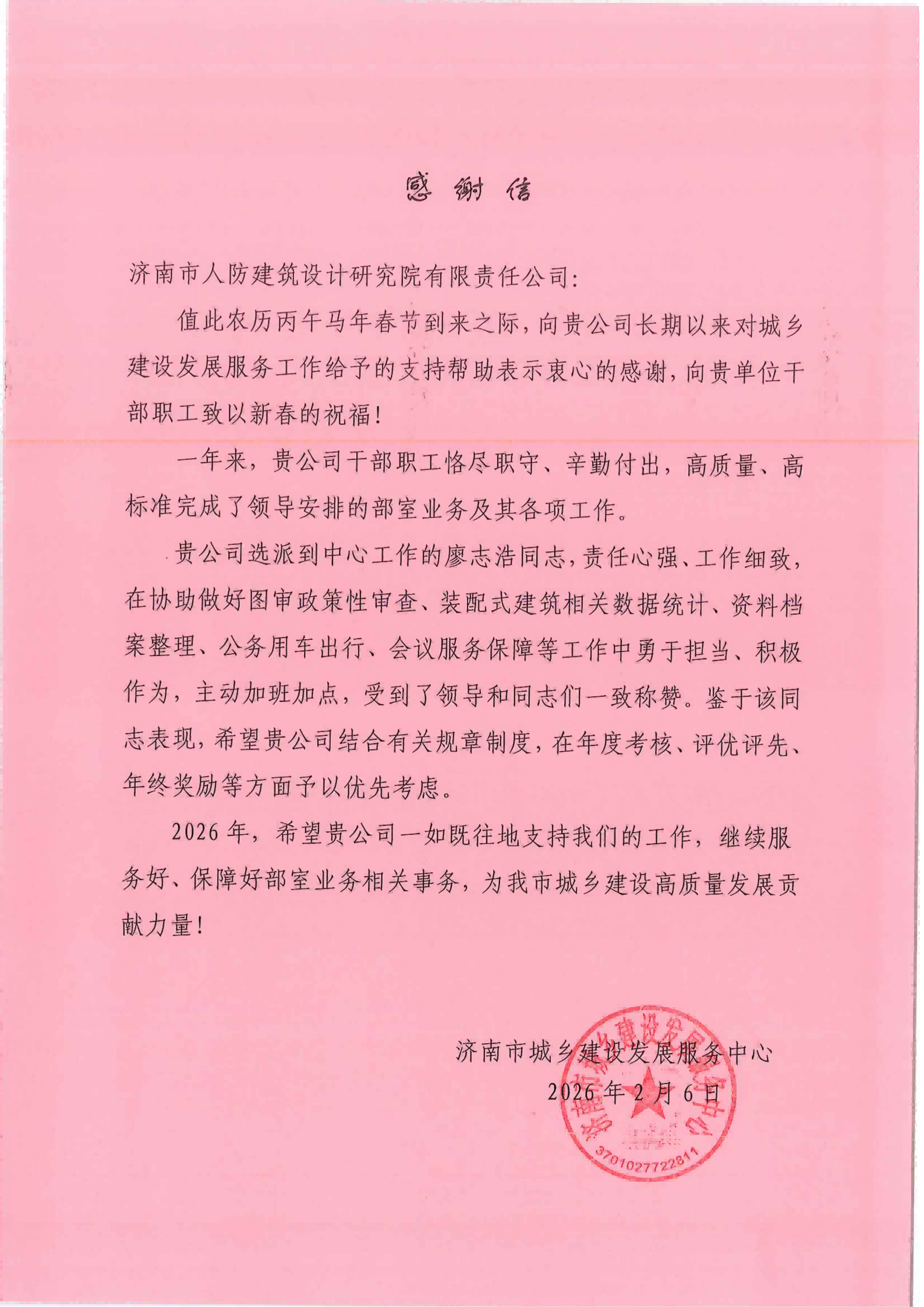 过往成绩皆为序章,崭新征程更需策马扬鞭。值此丙午马年新春,我院将以此次收获感谢信和锦旗为新的起点,认真梳理合作单位提出的宝贵建议,在技术服务标准化、响应时效精细化、协作机制长效化等方面持续改进。我们将继续选派政治过硬、技术精湛的业务骨干服务一线,以“精益求精、敢于担当”的优良作风,在济南市城乡建设的提质增效中、在各城区的升级跨越中,为济南城市建设注入更具分量的“人防方案”、汇聚更显担当的“人防力量”。