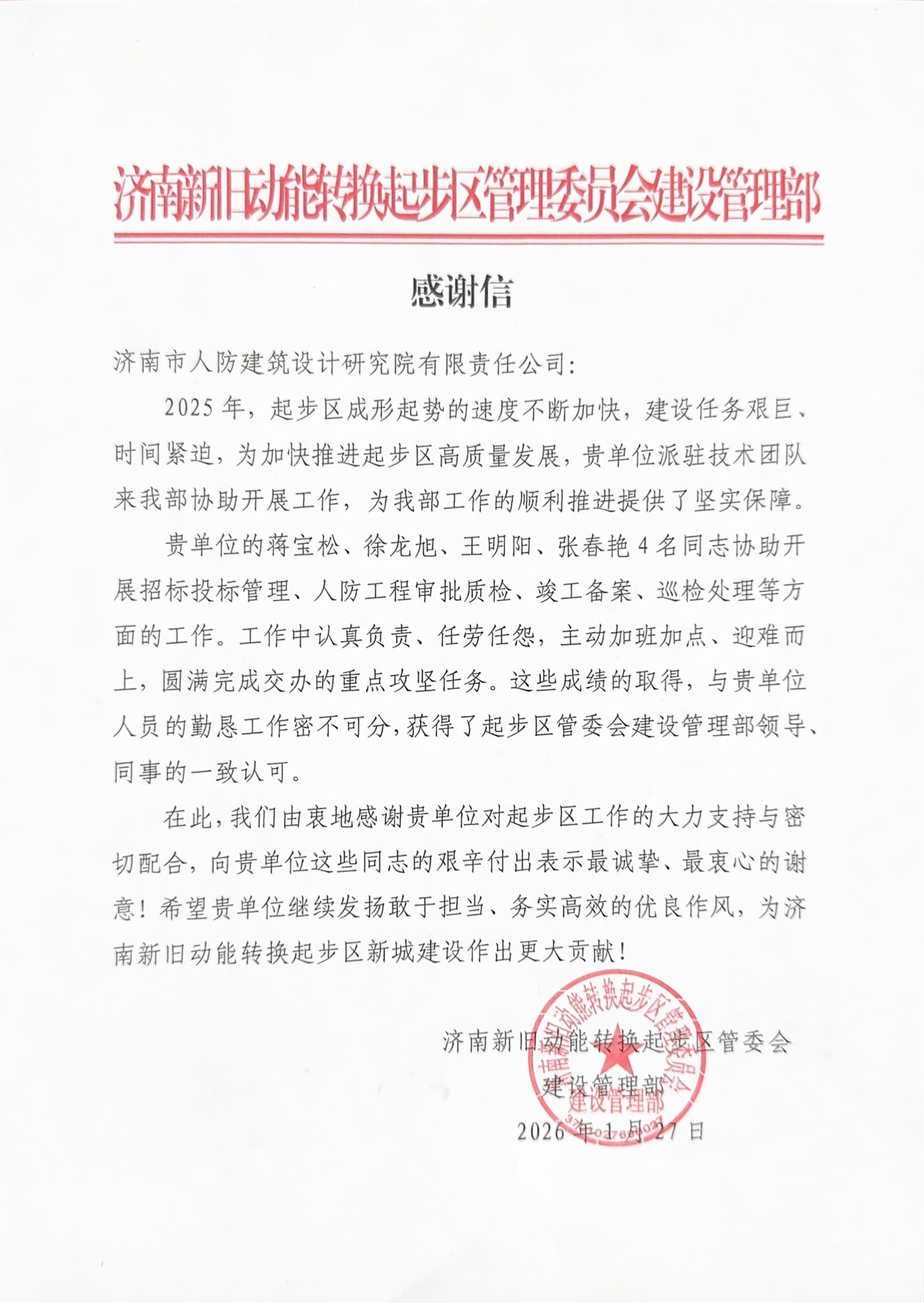 近日,我院陆续收到来自济南高新区管委会审批服务部、济南市城乡建设发展服务中心、济南新旧动能转换起步区管理委员会建设管理部、济南中央商务区投资建设集团有限公司等多家单位的感谢信。
